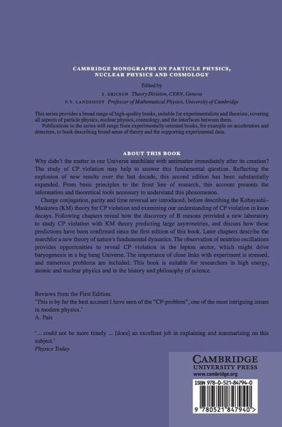 Why didn't the matter in our Universe annihilate with antimatter immediately after its creation? The study of CP violation may help to answer this fundamental question. This book presents theoretical tools necessary to understand this phenomenon. Reflecting the explosion of new results over the last decade, this second edition has been substantially expanded. It introduces charge conjugation, parity and time reversal, before describing the Kobayashi-Maskawa (KM) theory for CP violation and our understanding of CP violation in kaon decays. It reveals how the discovery of B mesons has provided a new laboratory to study CP violation with KM theory predicting large asymmetries, and discusses how these predictions have been confirmed since the first edition of this book. Later chapters describe the search for a new theory of nature's fundamental dynamics. This book is suitable for researchers in high energy, atomic and nuclear physics, and the history and philosophy of science.