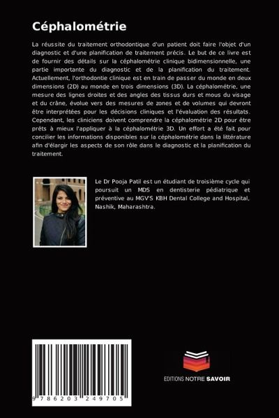 La réussite du traitement orthodontique d'un patient doit faire l'objet d'un diagnostic et d'une planification de traitement précis. Le but de ce livre est de fournir des détails sur la céphalométrie clinique bidimensionnelle, une partie importante du diagnostic et de la planification du traitement. Actuellement, l'orthodontie clinique est en train de passer du monde en deux dimensions (2D) au monde en trois dimensions (3D). La céphalométrie, une mesure des lignes droites et des angles des tissus durs et mous du visage et du crâne, évolue vers des mesures de zones et de volumes qui devront être interprétées pour les décisions cliniques et l'évaluation des résultats. Cependant, les cliniciens doivent comprendre la céphalométrie 2D pour être prêts à mieux l'appliquer à la céphalométrie 3D. Un effort a été fait pour concilier les informations disponibles sur la céphalométrie dans la littérature afin d'élargir les aspects de son rôle dans le diagnostic et la planification du traitement.