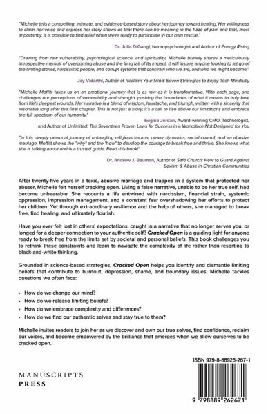 Are you ready to break free from patterns and beliefs that no longer serve you? Do you long to uncover your authentic self and lead a life rooted in self-trust, resilience, and purpose? In Cracked Open, Michelle Moffitt shares her powerful journey of breaking free from a toxic, abusive marriage and the systems that silenced her voice. Through her story of resilience, growth, and empowerment, Michelle invites readers to uncover their own strength, rediscover their true selves, and build lives rooted in authenticity and confidence. Drawing from her expertise as a therapist and leadership coach, Michelle combines deeply personal anecdotes with science-based tools to guide readers through the complexities of change, healing, and transformation. She explores themes of self-trust, boundary-setting, and embracing the vulnerability required to step into the unknown.Key Themes:Embracing the Power of Change Breaking Free from Limiting Beliefs Navigating Complex Relationships and Trauma Who This Book Is For:Those Ready for Change Women Seeking Empowerment Anyone Seeking Healing and Growth Why You'll Love Cracked Open With its blend of raw personal narrative and practical guidance, Cracked Open goes beyond memoir to serve as a transformative resource. Michelle offers actionable tools for cultivating boundaries, building self-trust, and navigating change with resilience. This book is a call to action for anyone ready to live boldly, break free from limiting beliefs, and embrace a fulfilling future built on confidence and joy. In discovering and owning our true selves, we will find confidence, reclaim our voices, and be empowered by the brilliance that emerges when we allow ourselves to be cracked open.