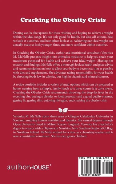 Dieting can be therapeutic for those wishing and hoping to achieve a weight within the ideal range. It's not only good for health, but also self-esteem, how we look at ourselves, and how others look at us. Achieving our ideal weight can actually make us look younger, fitter, and more confident within ourselves. In Cracking the Obesity Crisis, author and nutritional consultant Veronica M. McNally presents insight into orthodox medicine to help you reach your maximum potential for health and achieve your ideal weight. Sharing her research and findings, McNally offers a thorough look at health and gives advice and recommendation on how to allow your body to become as slim as possible with diet and supplements. She advocates taking responsibility for your health by choosing foods low in calories, but high in vitamin and mineral content. A recipe portfolio includes a variety of meal options which can be prepared at home, ranging from a simple, family lunch to a three-course à la carte menu. Cracking the Obesity Crisis recommends throwing the deep-fat fryer in the recycling bin, buying a blender or food processor and a good quality steamer, getting fit, getting slim, enjoying life again, and cracking the obesity crisis.