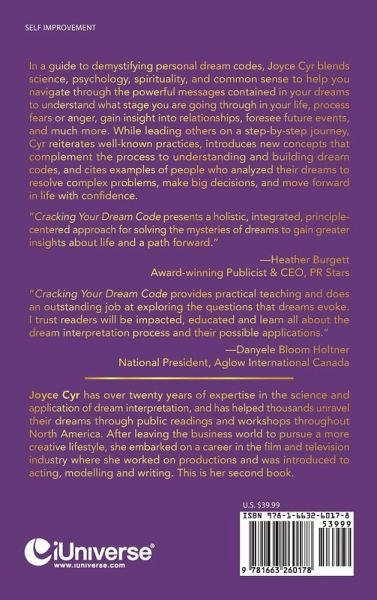 In a guide to demystifying personal dream codes, Joyce Cyr blends science, psychology, spirituality, and common sense to help you navigate through the powerful messages contained in your dreams to understand what stage you are going through in your life, process fears or anger, gain insight into relationships, foresee future events, and much more. While leading others on a step-by-step journey, Cyr reiterates well-known practices, introduces new concepts that complement the process to understanding and building dream codes, and cites examples of people who analyzed their dreams to resolve complex problems, make big decisions, and move forward in life with confidence.