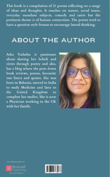 This book is a compilation of 21 poems reflecting on a range of ideas and thoughts. It touches on social issues, nature and everyday mundane things and engages in satire and subtle comedy but the pertinent theme is one of human connection. The poems expresses a lot through questions to engage its readers to think and to think again.