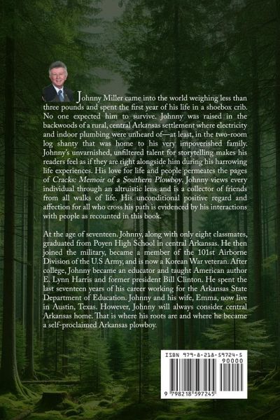 Johnny Miller came into the world weighting less than three pounds, and spent the first year of his life in a shoebox crib. No one expected him to survive, Johnny was raised in the backwoods of a rural, central Arkansas settlement, where electricity and indoor plumbing were unheard of--at least, in the two-room log shanty that was home to his very impoverished family. Johnny's unvarnished, unfiltered talent for storytelling makes his readers feel as if they are right alongside him during his harrowing life experiences. His love for life and people permeates the pages of Cracks: Memoir of a Southern Plowboy. At the age of seventeen, Johnny, along with only eight classmates, graduated from Poyen High School. He then joined the military, became a member of the 101st Airborne Division of the U.S. Army, and is now a veteran of the Korean War. After college, Johnny became an educator whose students included author E. Lynn Harris and former President Bill Clinton. He spent the last twenty-three years of his career working for the Arkansas State Department of Education. He and his wife, Emma, now live in Austin, Texas. However, Johnny will always consider central Arkansas home. That is where his roots are and where he became a self-proclaimed southern plowboy.