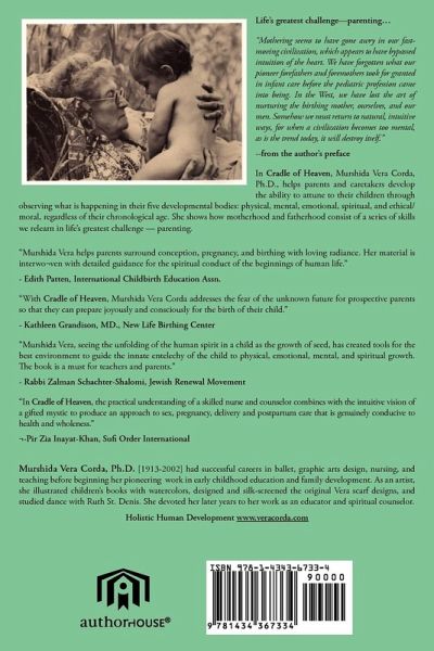 Life's greatest challenge-parenting In Cradle of Heaven, Murshida Vera Corda, Ph.D., helps parents and caretakers develop the ability to attune to their children through observing what is happening in their five developmental bodies: physical, mental, emotional, spiritual, and ethical/moral, regardless of their chronological age. She shows how motherhood and fatherhood consist of a series of skills we relearn in life's greatest challenge - parenting. "Murshida Vera helps parents surround conception, pregnancy, and birthing with loving radiance. Her material is interwo¬ven with detailed guidance for the spiritual conduct of the beginnings of human life." - Edith Patten, International Childbirth Education Assn. "With Cradle of Heaven, Murshida Vera Corda addresses the fear of the unknown future for prospective parents so that they can prepare joyously and consciously for the birth of their child." - Kathleen Grandison, MD., New Life Birthing Center "Murshida Vera, seeing the unfolding of the human spirit in a child as the growth of seed, has created tools for the best environment to guide the innate entelechy of the child to physical, emotional, mental, and spiritual growth. The book is a must for teachers and parents." - Rabbi Zalman Schachter-Shalomi, Jewish Renewal Movement "In Cradle of Heaven, the practical understanding of a skilled nurse and counselor combines with the intuitive vision of a gifted mystic to produce an approach to sex, pregnancy, delivery and postpartum care that is genuinely conducive to health and wholeness." -Pir Zia Inayat-Khan, Sufi Order International