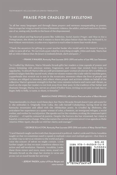 "The heartfelt poetry and essays in Cradled by Skeletons impart an argument that all be welcomed, as all are worthy. At once intimate, poignant, and raw, the entries of Cuban American poet, essayist, and activist Marta Miranda-Straub's Cradled by Skeletons reflect how she lives, loves, and creates at the intersections of queerness, feminism, and of being an American immigrant of color. "Miranda-Straub relates that her boundary crossing began early. Her poem "The Cradle" shares a message received from her twin sister who died in the womb: 'Always remember that your big sister is watching out for you. / Breathe, beat, swim, stretch, grasp, swallow. Your time is now.' Elsewhere, 'The Feast' pays homage to her Cuban grandmother's abiding love. "Striking and multisensory, lines evoke the smells of orange peel and melted brown sugar; the flame of red tiles lining the stove; the cracked porcelain of the sink; and the sight of her grandmother's hands as she prepares the special treat to carry on the trip to America. 'I carry Abuelita's warmth and sweetness close to my sprouting chest,' she writes. "Spare and eloquent, the chosen words carry deeper messages about grief and hope. Other poems hold tragedy and rage: 'When Ancestors Call' is about the legacy and brutality of slavery and rape, while 'The Prince Was a Frog' captures the disillusionment and pain of an unhappy marriage and ends with the urge to rise up and claim a new life. "Profound essays concentrate on joy, sorrow, and astonishment. 'Upon Being Brown in the South' is a moving expression of Miranda-Straub's love for the mountains of Kentucky, so strong that she identifies as 'Cubalachian,' although she looks, lives, and loves in different ways than most of her neighbors. Her shock and hurt is palpable when, though she is an American citizen, a white Appalachian neighbor questions her right to vote based on her appearance. "Elsewhere, the writing is warm and humorous. 'A Day in the Life,' about the adventures of two inexperienced women living in the mountain wilderness, includes the reflection that 'we don't know how to properly handle poisonous snakes ... all those years of Catholic graduate education, and not one damn course in snake handling.' "Presented in both English and Spanish, the book is an expression of vitality and of being open to all that life has to offer. It approaches American society with both appreciation and criticism, noting that, while it is rich in material things, it operates out of fear of scarcity and of difference, rendering Latino people, the latest and largest group of immigrants to the US, targets of racism. The text invites a larger, more curious, and more welcoming worldview. "The poetry and essays in Cradled by Skeletons embrace immigrants, broken people, and people otherwise disillusioned and dispossessed. Their heartfelt beauty and hunger for justice impart a sense that all be welcomed, as all are worthy." Clarion Foreword Reviews