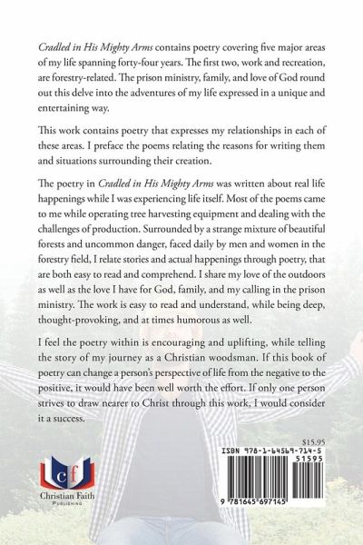 Cradled in His Mighty Arms contains poetry covering five major areas of my life spanning forty-four years. The first two, work and recreation, are forestry-related. The prison ministry, family, and love of God round out this delve into the adventures of my life expressed in a unique and entertaining way. This work contains poetry that expresses my relationships in each of these areas. I preface the poems relating the reasons for writing them and situations surrounding their creation. The poetry in Cradled in His Mighty Arms was written about real life happenings while I was experiencing life itself. Most of the poems came to me while operating tree harvesting equipment and dealing with the challenges of production. Surrounded by a strange mixture of beautiful forests and uncommon danger, faced daily by men and women in the forestry field, I relate stories and actual happenings through poetry, that are both easy to read and comprehend. I share my love of the outdoors as well as the love I have for God, family, and my calling in the prison ministry. The work is easy to read and understand, while being deep, thought-provoking, and at times humorous as well. I feel the poetry within is encouraging and uplifting, while telling the story of my journey as a Christian woodsman. If this book of poetry can change a person's perspective of life from the negative to the positive, it would have been well worth the effort. If only one person strives to draw nearer to Christ through this work, I would consider it a success.