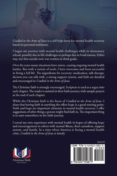Cradled in the Arms of Jesus is a self-help book for mental health recovery based on personal testimony. I began my journey with mental health challenges while in elementary school, possibly due to life challenges or perhaps due to head trauma. Either way, my first suicide note was written in third grade. Over the years many situations have arisen, causing ongoing mental health battles. But with a variety of tools, I have overcome and been successful in living a full life. The ingredients for recovery: medication, talk therapy, doctors you can talk with, a strong support system, and faith are detailed and encouraged in Cradled in the Arms of Jesus. The Christian faith is strongly encouraged. Scripture is used as a segue into each chapter. The reader is assisted in their faith journey with sample prayers at the end of each chapter. While the Christian faith is the focus of Cradled in the Arms of Jesus, Phaedra shares that using faith in anything, as a starting point, will help in mental health recovery. Phaedra offers suggestions of other things a person might find faith in. The important thing is to start somewhere in the faith journey. Phaedra reveals her own experience with mental health in hopes of offering hope and encouragement to others with mental illness, their caretakers, support system, and family. In a time when America is facing a mental health crisis, Cradled in the Arms of Jesus is timely.