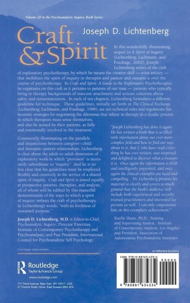 In Craft and Spirit, Joseph Lichtenberg writes of the craft of exploratory psychotherapy, by which he means the creative skill - even artistry - that mobilizes the spirit of inquiry in therapist and patient and sustains it over the course of psychotherapy. He expatiates on this craft as it pertains to patients of our time - patients who typically bring to therapy backgrounds of insecure attachment and serious concerns about safety and retraumatization. In each of ten chapters, Lichtenberg formulates a different guideline for technique, keyed to the broad domain of exploratory psychotherapies and are accompanied by numerous clinical illustrations. These guidelines seek to foster greater therapist involvement without compromising an openness to psychological exploration. They seek to sensitize therapists to the two interlacing tracks of communication that unfold in treatment: those of verbal exchange and of enactive messages. And they help guide therapist attention among interpenetrating domains of the patient's subjectivity, the therapist's subjectivity, and the intersubjective realm that emerges from their collaborative experience. Fusing the humanist tradition of therapeutic inquiry with knowledge gained from recent infancy and child research, Lichtenberg develops guidelines suitable to exploratory therapy with patients who communicate not only verbally but also through diverse affect states and altered cognitions. Consistently illuminating on the parallels and disjunctions between caregiver-child and therapist-patient relationships, Lichtenberg is clear about the adult-to-adult dimension of exploratory work in which "provision" is necessarily subordinate to "inquiry." Craft and Spirit is aimed equally at prospective patients, therapists, and analysts, all of whom will be edified by this masterful demonstration of the ways in which a spirit of inquiry imbues the craft of psychotherapy, in Lichtenberg's words, "with its liveliness of sustained purpose."