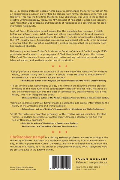 The hidden history of the creative writing workshop and the socioeconomic consequences of the craft labor metaphor. In a letter dated September 1, 1912, drama professor George Pierce Baker recommended the term workshop for an experimental course in playwriting he had been planning with former students at Harvard and Radcliffe. This was the first time that term, now ubiquitous, was used in the context of creative writing pedagogy. Today, the MFA (master of fine arts) industry is a booming one, with more than 200 programs and thousands of residencies and conferences for aspiring writers nationwide. Almost all of these offerings operate on the workshop model. In Craft Class, Christopher Kempf argues that the primary institutional form of creative writing studies, the workshop, has remained invisible before our scholarly eyes. While Baker and others marshaled craft toward economic critique, craft pedagogies consolidated the authority of elite educational institutions as the MFA industry grew. Transcoding professional-managerial soft skills--linguistic facility, social and emotional discernment, symbolic fluency--in the language of manual labor, the workshop nostalgically invokes practices that the university itself has rendered obsolete. The workshop poem or short story thus shares discursive space with the craft IPA or hand-loomed Pottery Barn rug--a space in which one economic practice rewrites itself in the language of another, just as right-wing corporatism continuously rewrites itself in the language of populism. Delineating an arc that extends from Boston's fin de siècle Society of Arts and Crafts through 1930s proletarian workshops to the pedagogies of Black Mountain College and the postwar MFA, Craft Class reveals how present-day creative writing restructures transhistorical questions of labor, education, and aesthetic and economic production. With the rise of the workshop in American culture, Kempf shows, manual and mental labor have been welded together like steel plates. What fissures does that weld seal shut? And on whose behalf does the poet punch in?