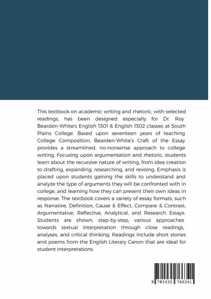 This textbook on academic writing and rhetoric, with selected readings, has been designed especially for Dr. Roy Bearden-White's English 1301 & English 1302 classes at South Plains College. Based upon seventeen years of teaching College Composition, Bearden-White's Craft of the Essay provides a streamlined, no-nonsense approach to college writing. Focusing upon argumentation and rhetoric, students learn about the recursive nature of writing, from idea creation to drafting, expanding, researching, and revising. Emphasis is placed upon students gaining the skills to understand and analyze the type of arguments they will be confronted with in college, and learning how they can present their own ideas in response. The textbook covers a variety of essay formats, such as Narrative, Definition, Cause & Effect, Compare & Contrast, Argumentative, Reflective, Analytical, and Research Essays. Students are shown, step-by-step, various approaches towards textual interpretation through close readings, analyses, and critical thinking. Readings include short stories and poems from the English Literary Canon that are ideal for student interpretations.