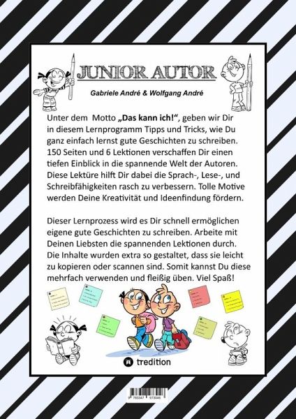 In dieser speziellen Craftbook Ausgabe "Junior Autor", lernst Du in 6. Lektionen einige besonders gute Techniken, welche Dir helfen werden gute und möglichst fehlerfreie Geschichten zu schreiben. Dazu benötigen wir einige Hilfsmittel. Im Besonderen dieses Fachbuch für Kinder und Jugendliche mit Lese- und Schreibschwächen, um gut vorbereitet zu sein. Lass Dich einfach unbekümmert auf neue Abenteuer ein. Schnell wirst Du auch feststellen, dass gewisse Dinge gar nicht so schwer sind, wie sie vielleicht im Moment erscheinen. Im Verlauf der Übungen, in den jeweiligen Lektionen wirst Du rasch eine Verbesserung Deines Schreibstils bemerken. Arbeite in den Lektionen aufmerksam und geduldig. Schnell wirst Du merken, dass plötzlich einiges leichter von der Hand geht. Ohne Druck arbeite die Punkte der 6 Lektionen durch. Mach diese Übungen, solange sie Dir Spass machen. Nimm Dir für jedes einzelne Thema genügend Zeit und mach Dir Gedanken, was Du gerne in Deinen Geschichten erzählen möchtest. Mit einer guten Geschichte wirst Du sicherlich andere damit begeistern können. Deine Liebsten helfen Dir sicher dabei. Überdies kann es sehr lustig und spannend sein, wenn Du ohne Druck neue Themen entdeckst. Also nimm Dir Zeit und lerne jeden Tag etwas Neues dazu. Bald wirst Du ein kleiner Junior Autor sein und viele gute Geschichten schreiben.Unsere Craftbooks haben einen enormen Unterhaltungswert. Besonders schöne Motive als Ausmalvorlage fördern die Kreativität. Knifflige Aufgaben und Rätsel stärken das Konzentrationsvermögen. Auch findet man Spiele darin, welche nicht im Handel erhältlich sind. Bastelvorschläge und Anregungen eine bestimmte Sache nach eigener Vorstellung zu verwirklichen runden den Inhalt ab. Der Mehrwert besteht darin, dass man zu Ideen und Kreativität inspiriert wird. Der soziale Aspekt sich einer analogen Tätigkeit zu widmen, fördert Geschick, Fingerfertigkeit und die geistigen Fähigkeiten. Das vielfältige Angebot der Inhalte und Vorgaben der Craftbook Bandreihe fördert die Kreativität, insbesondere die Konzentration und erleichtert ebenso das Erlernen der kognitiven und motorischen Fähigkeiten. Die ausgewählten Bilder erwecken ein besonderes Interesse, erworbene Fähigkeiten des Zeichnens anzuwenden, um ideenreiche eigene Werke zu erschaffen. Der erlebte Moment der bemühten Tätigkeit ein schönes Bild nach der eigenen Vorstellung zu vollenden, beruhigt das Gemüt der Kleinen und steigert das Selbstwertgefühl. Der erlebte Moment der bemühten Tätigkeit ein schönes Bild nach der eigenen Vorstellung zu vollenden, oder zu basteln, beruhigt das Gemüt der Kleinen und steigert das Selbstwertgefühl. Überdies schafft die Beschäftigung mit den Vorgaben, welche aus Aufgaben, Rätsel und Bastelanregungen und Malthemen bestehen, einen stressfreien Zustand, wenn die Farben fließen. Ausführende Tätigkeiten schaffen Freiraum für das geistige Wohlbefinden der Kleinen, welche auch deren Ideenreichtum im Schaffungsprozess fördert.