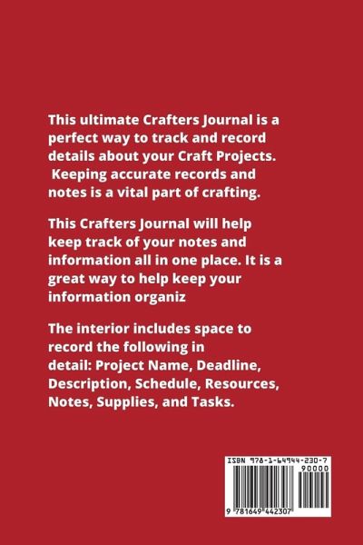 This Crafters Journal is perfect to keep track of all your craft projects. It will keep you organized, help you get creative and log all your important information all in one place. Designed with a 2 page layout. The first page is for prompted details. The following page is blank lined notes and can be used to write anything you wish such as pattern number, diy ideas, knitting notes, shopping list, thread colors, stitching friends, favorite designs, needlework ideal list, etc. The details section includes space for: Project Name Deadline Description Schedule Resources Notes Supplies Tasks Will make a great gift for that special crafter in your life. Easy to use. Size is 6x9 inches, 84 pages, white paper, soft matte finish cover, paperback. Grab one today & start planning your crafts!