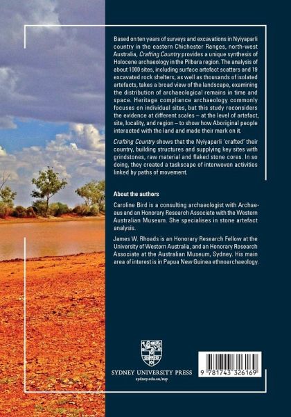 Based on ten years of surveys and excavations in Nyiyaparli country in the eastern Chichester Ranges, north-west Australia, Crafting Country provides a unique synthesis of Holocene archaeology in the Pilbara region. The analysis of about 1000 sites, including surface artefact scatters and 19 excavated rock shelters, as well as thousands of isolated artefacts, takes a broad view of the landscape, examining the distribution of archaeological remains in time and space. Heritage compliance archaeology commonly focuses on individual sites, but this study reconsiders the evidence at different scales – at the level of artefact, site, locality, and region – to show how Aboriginal people interacted with the land and made their mark on it. Crafting Country shows that the Nyiyaparli ‘crafted’ their country, building structures and supplying key sites with grindstones, raw material and flaked stone cores. In so doing, they created a taskscape of interwoven activities linked by paths of movement.