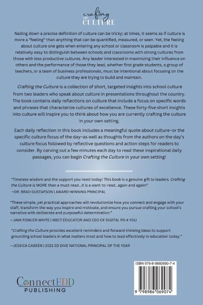 Nailing down a precise definition of culture can be tricky; at times, it seems as if culture is more a "feeling" than anything that can be quantified, measured, or seen. Yet, the feeling about culture one gets when entering any school or classroom is palpable and it is relatively easy to distinguish between schools and classrooms with strong cultures from those with less productive cultures. Any leader interested in maximizing their influence on others and the performance of those they lead, whether first-grade students, a group of teachers, or a team of business professionals, must be intentional about focusing on the culture they are trying to build and maintain. Crafting the Culture is a collection of short, targeted insights into school culture from two leaders who speak about culture in presentations throughout the country. The book contains daily reflections on culture that include a focus on specific words and phrases that characterize cultures of excellence. These forty-five short insights into culture will inspire you to think about how you are currently crafting the culture in your own setting. Each daily reflection in this book includes a meaningful quote about culture-or the specific culture focus of the day-as well as thoughts from the authors on the day's culture focus followed by reflective questions and action steps for readers to consider. By carving out a few minutes each day to read these inspirational daily passages, you can begin Crafting the Culture in your own setting!