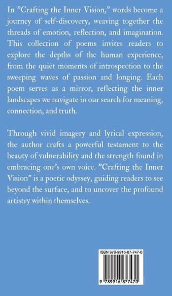 In "Crafting the Inner Vision," words become a journey of self-discovery, weaving together the threads of emotion, reflection, and imagination. This collection of poems invites readers to explore the depths of the human experience, from the quiet moments of introspection to the sweeping waves of passion and longing. Each poem serves as a mirror, reflecting the inner landscapes we navigate in our search for meaning, connection, and truth. Through vivid imagery and lyrical expression, the author crafts a powerful testament to the beauty of vulnerability and the strength found in embracing one's own voice. "Crafting the Inner Vision" is a poetic odyssey, guiding readers to see beyond the surface, and to uncover the profound artistry within themselves. Copyright © 2024 Book Fairy Publishing
