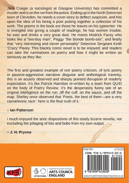 Jack Craigie (a sociologist at Glasgow University) has committed a murder and is on the run from the police. Ending up in the North Somerset town of Clevedon, he needs a cover-story to deflect suspicion, and hits upon the idea of his being a poet putting together a collection of his work. The poems in the book are those he leaves on his typewriter. He is inveigled into giving a couple of readings, he has women trouble, he eats and drinks a very great deal. He meets Modrick Facey who looks like a "two-boy man", Peggy "the blonde bomb-site", and finally that "very interesting and clever personality" Detective Sergeant Keith 'Crazy' Pavey. This blackly comic novel is to be enjoyed; and readers can take the ruminations on poetry and how it might be written as seriously as they like. "The first and greatest example of noir poetry criticism, of lyric poetry in passive-aggressive narrative disguise and anthological travesty, this is an acutely observed and sharply pointed disruption of readerly expectation. It's like Patrick Hamilton re-written by a team from QUID on the body of Poetry Review. It's the desperately funny tale of an original intelligence on the run, off the cuff, on the sauce, and off the map. Shelley once observed that 'Poets, the best of them-are a very camæleonic race': here is the final truth of it." - Ian Patterson "I much enjoyed the antic dispositions of this totally bizarre novella, not excluding the pillaging of bits and bobs from my own output." - J. H. Prynne