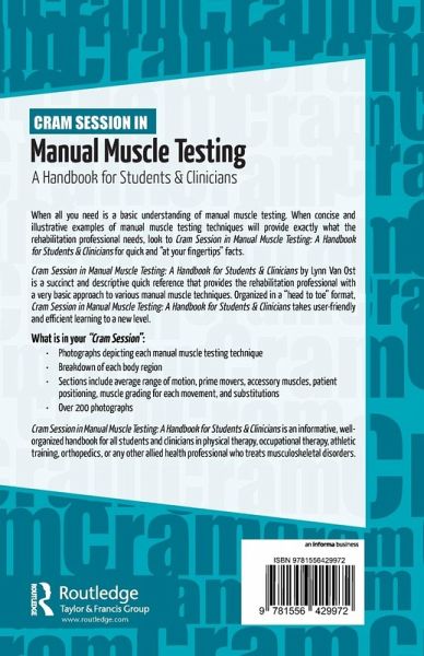 When concise and illustrative examples of manual muscle testing techniques will provide exactly what the rehabilitation professional needs, look to Cram Session in Manual Muscle Testing: A Handbook for Students & Clinicians for quick and "at your fingertips" facts.