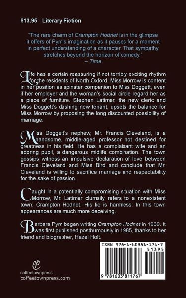 Life has a certain reassuring if not terribly exciting rhythm for the residents of North Oxford. Miss Morrow is content in her position as spinster companion to Miss Doggett, even if her employer and the woman's social circle regard her as a piece of furniture. Stephen Latimer, the new cleric and Miss Doggett's dashing new tenant, upsets the balance for Miss Morrow by proposing the long discounted possibility of marriage. Miss Doggett's nephew, Mr. Francis Cleveland, is a handsome, middle-aged professor not destined for greatness in his field. He has a complaisant wife and an adoring pupil, a dangerous midlife combination. The town gossips witness an impulsive declaration of love between Francis Cleveland and Miss Bird and conclude that Mr. Cleveland is willing to sacrifice marriage and respectability for the sake of passion. Caught in a potentially compromising situation with Miss Morrow, Mr. Latimer clumsily refers to a nonexistent town: Crampton Hodnet. His lie is harmless. In this town appearances are much more deceiving. Barbara Pym began writing Crampton Hodnet in 1939. It was first published posthumously in 1987, thanks to her friend and biographer, Hazel Holt.