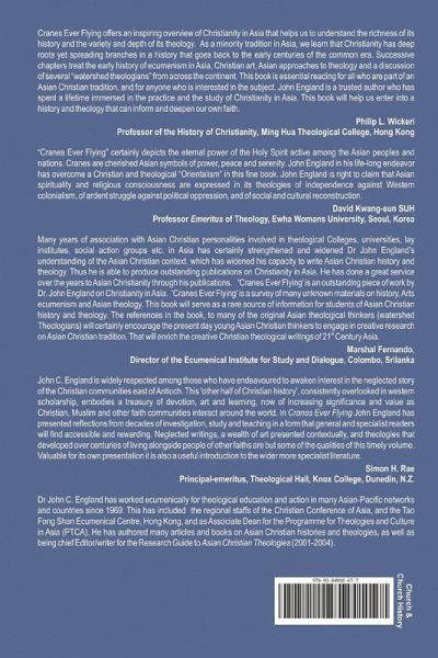 Cranes Ever Fying offers an inspiring overview of Christianity in Asia that helps us to understand the richness of its history and the variety and depth of its theology. As a minority tradition in Asia, we learn that Chrstianty has deep roots yet spreading branches in a history that goes back to the early centuries of he common era. Successive chapters treat the earty history of ecumenism in Asia, Christian art. Asian approaches to theology and a discussion of several watershed thealogians' from across the continent. This book is essential reading for all who are part of an Asian Christian tradition, and for anyone who is interested in the subject. John England is a tnusted author who has spent a lifetime immersed in the practice and the study of Christianity in Asia. This book will help us enter into a history and theology that can inform and deepen our own faith.