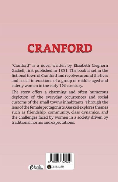 ""Cranford"" is a novel written by Elizabeth Cleghorn Gaskell, first published in 1851. The book is set in the fictional town of Cranford and revolves around the lives and social interactions of a group of middle-aged and elderly women in the early 19th century. The story offers a charming and often humorous depiction of the everyday occurrences and social customs of the small town's inhabitants. Through the lens of the female protagonists, Gaskell explores themes such as friendship, community, class dynamics, and the challenges faced by women in a society driven by traditional norms and expectations.