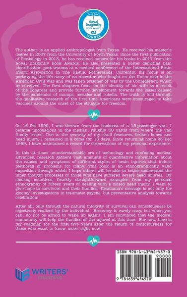 Bryan Sisson is an applied anthropologist from Texas. He received his master's degree in 2007 from the University of North Texas. Since the first publication of Peribology in 2013, he has received honors for his books in 2017 from the Royal Dragonfly Book Awards. He also presented a poster depicting pain identification post trauma at a medical conference of the International Brain Injury Association in The Hague, Netherlands. Currently, his focus is on portraying the life story of an ancestor who fought on the Union side in the American Civil War and was taken prisoner of war by the Confederacy, which he survived. The first chapters focus on the identity of his wife as a result of the congress and provide further development towards the losses caused by the pandemics of mumps, measles, and rubella. The truth is told through the qualitative research of the first time Americans were encouraged to take vaccines around the onset of the perturbation. In this at times ununderstandable era of technology and confusing medical advances, research gathers vast amounts of quantitative information about the causes and symptoms of different styles of brain injuries that induce plethoras of problems for many. This book is an ethnographically valid exposition through which I hope others will be able to better understand the inner thought processes of those who have suffered severe head injuries. By sharing countless, frankly straightforward examples from my personal ethnography of fifteen years of dealing with a closed head injury, I want to give hope to survivors and their families. Craniama's message is not only for gloomy investigations of the traumatic psyche, but preventative analysis towards celebration! After all, only through the natural integrity of survival can consciousness be objectively realized by the individual. Recovery is rarely easy, but when you can, do not be afraid to wake up again! I am convinced that the medical community will help the families of the injured at this time. For now, here is my roadmap for the first five years after the return of consciousness for those who want to know more, right now.