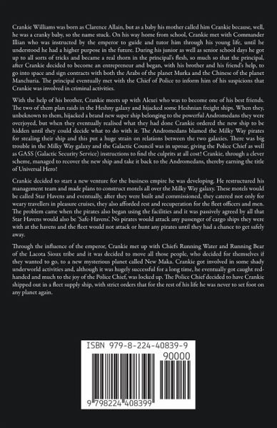 Crankie Williams was born as Clarence Allain, but as a baby his mother called him Crankie because, well, he was a cranky baby, so the name stuck. On his way home from school, Crankie met with Commander Illian who was instructed by the emperor to guide and tutor him through his young life, until he understood he had a higher purpose in the future. During his junior as well as senior school days he got up to all sorts of tricks and became a real thorn in the principal's flesh, so much so that the principal, after Crankie decided to become an entrepreneur and began, with his brother and his friend's help, to go into space and sign contracts with both the Arabs of the planet Murka and the Chinese of the planet Manchuria. The principal eventually met with the Chief of Police to inform him of his suspicions that Crankie was involved in criminal activities. With the help of his brother, Crankie meets up with Alexei who was to become one of his best friends. The two of them plan raids in the Heshny galaxy and hijacked some Heshnian freight ships. When they, unbeknown to them, hijacked a brand new super ship belonging to the powerful Andromedans they were overjoyed, but when they eventually realised what they had done Crankie ordered the new ship to be hidden until they could decide what to do with it. The Andromedans blamed the Milky Way pirates for stealing their ship and this put a huge strain on relations between the two galaxies. There was big trouble in the Milky Way galaxy and the Galactic Council was in uproar, giving the Police Chief as well as GASS (Galactic Security Service) instructions to find the culprits at all cost! Crankie, through a clever scheme, managed to recover the new ship and take it back to the Andromedans, thereby earning the title of Universal Hero! Crankie decided to start a new venture for the business empire he was developing. He restructured his management team and made plans to construct motels all over the Milky Way galaxy. These motels would be called Star Havens and eventually, after they were built and commissioned, they catered not only for weary travellers in pleasure cruises, they also afforded rest and recuperation for the fleet officers and men. The problem came when the pirates also began using the facilities and it was passively agreed by all that Star Havens would also be 'Safe-Havens'. No pirates would attack any passenger of cargo ships they were with at the havens and the fleet would not attack or hunt any pirates until they had a chance to get safely away. Through the influence of the emperor, Crankie met up with Chiefs Running Water and Running Bear of the Lacota Sioux tribe and it was decided to move all those people, who decided for themselves if they wanted to go, to a new mysterious planet called New Maka. Crankie got involved in some shady underworld activities and, although it was hugely successful for a long time, he eventually got caught red-handed and much to the joy of the Police Chief, was locked up. The Police Chief decided to have Crankie shipped out in a fleet supply ship, with strict orders that for the rest of his life he was never to set foot on any planet again.