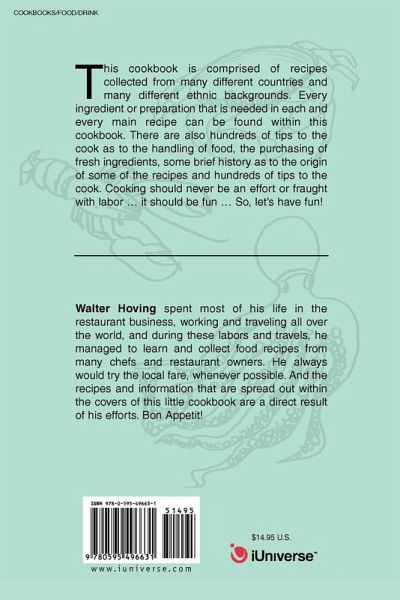 This cookbook is comprised of recipes collected from many different countries and many different ethnic backgrounds. Every ingredient or preparation that is needed in each and every main recipe can be found within this cookbook. There are also hundreds of tips to the cook as to the handling of food, the purchasing of fresh ingredients, some brief history as to the origin of some of the recipes and hundreds of tips to the cook. Cooking should never be an effort or fraught with labor . it should be fun . So, let's have fun!