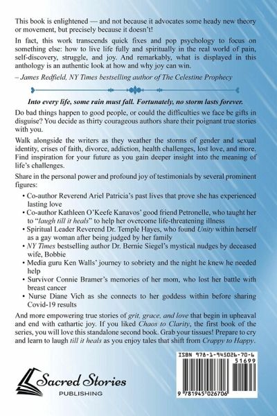 Into every life, some rain must fall. Fortunately, no storm lasts forever. Do bad things happen to good people, or could the difficulties we face be gifts in disguise? You decide as thirty courageous authors share their poignant true stories with you. Walk alongside the writers as they weather the storms of gender and sexual identity, crises of faith, divorce, addiction, health challenges, lost love, and more. Find inspiration for your future as you gain deeper insight into the meaning of life's challenges. Share in the personal power and profound joy of testimonials by several prominent figures: ¿ Co-author Reverend Ariel Patricia's past lives that prove she has experienced lasting love ¿ Co-author Kathleen O'Keefe Kanavos' good friend Petronelle, who taught her to "laugh till it heals" to help her overcome life-threatening illness ¿ Spiritual Leader Reverend Dr. Temple Hayes, who found Unity within herself as a gay woman after being judged by her family ¿ NY Times bestselling author Dr. Bernie Siegel's mystical nudges by deceased wife, Bobbie ¿ Media guru Ken Walls' journey to sobriety and the night he knew he needed help ¿ Survivor Connie Bramer's memories of her mom, who lost her battle with breast cancer ¿ Nurse Diane Vich as she connects to her goddess within before sharing Covid-19 results ¿ Animal intuitive Ellie Pechet who received guidance from her beloved cats after their transitions. And more empowering true stories of grit, grace, and love that begin in upheaval and end with cathartic joy. If you liked Chaos to Clarity, the first book of the series, you will love this standalone second book. Grab your tissues! Prepare to cry and learn to laugh till it heals as you enjoy tales that shift from Crappy to Happy.