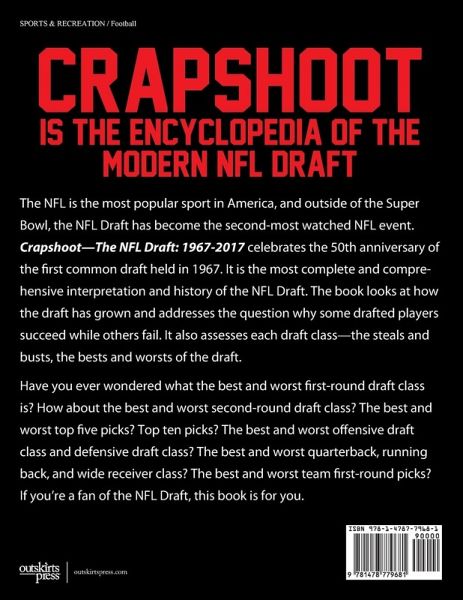 Crapshoot is the encyclopedia of the modern NFL draft. The NFL is the most popular sport in America, and outside of the Super Bowl, the NFL Draft has become the second-most watched NFL event. Crapshoot-The NFL Draft: 1967-2017 celebrates the 50th anniversary of the first common draft held in 1967. It is the most complete and comprehensive interpretation and history of the NFL Draft. The book looks at how the draft has grown and addresses the question why some drafted players succeed while others fail. It also assesses each draft class-the steals and busts, the bests and worsts of the draft. Have you ever wondered what the best and worst first-round draft class is? How about the best and worst second-round draft class? The best and worst top five picks? Top ten picks? The best and worst offensive draft class and defensive draft class? The best and worst quarterback, running back, and wide receiver class? The best and worst team first-round picks? If you're a fan of the NFL Draft, this book is for you.