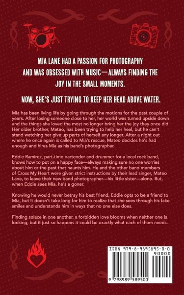 Mia Lane had a passion for photography and was obsessed with music-always finding the joy in the small moments. Now, she's just trying to keep her head above water. Mia has been living life by going through the motions for the past couple of years. After losing someone close to her, her world was turned upside down and the things she loved the most no longer bring her the joy they once did. Her older brother, Mateo, has been trying to help her heal, but he can't stand watching her give up parts of herself any longer. After a night out where he once again is called to Mia's rescue, Mateo decides he's had enough and hires Mia as his band's photographer. Eddie Ramirez, part-time bartender and drummer for a local rock band, knows how to put on a happy face-always making sure no one worries about him or the past that haunts him. He and the other band members of Cross My Heart were given strict instructions by their lead singer, Mateo Lane, to leave their new band photographer-his little sister-alone. But, when Eddie sees Mia, he's a goner. Knowing he would never betray his best friend, Eddie opts to be a friend to Mia, but it doesn't take long for him to realize that she sees through his fake smiles and understands him in ways that no one else does. Finding solace in one another, a forbidden love blooms when neither one is looking, but it just so happens it could be exactly what each of them needs.