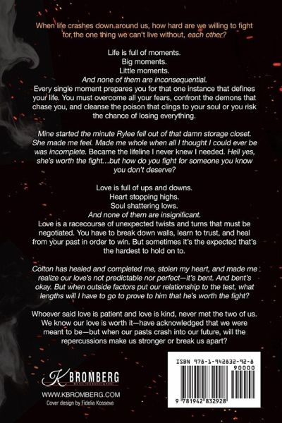 When life crashes down around us, how hard are we willing to fight for the one thing we can't live without, each other? Life is full of moments. Big moments. Little moments. And none of them are inconsequential. Every single moment prepares you for that one instance that defines your life. You must overcome all your fears, confront the demons that chase you, and cleanse the poison that clings to your soul or you risk the chance of losing everything. Mine started the minute Rylee fell out of that damn storage closet. She made me feel. Made me whole when all I thought I could ever be was incomplete. Became the lifeline I never knew I needed. Hell yes, she's worth the fight...but how do you fight for someone you know you don't deserve? Love is full of ups and downs. Heart stopping highs. Soul shattering lows. And none of them are insignificant. Love is a racecourse of unexpected twists and turns that must be negotiated. You have to break down walls, learn to trust, and heal from your past in order to win. But sometimes it's the expected that's the hardest to hold on to. Colton has healed and completed me, stolen my heart, and made me realize our love's not predictable nor perfect-it's bent. And bent's okay. But when outside factors put our relationship to the test, what lengths will I have to go to prove to him that he's worth the fight? Whoever said love is patient and love is kind, never met the two of us. We know our love is worth it-have acknowledged that we were meant to be-but when our pasts crash into our future, will the repercussions make us stronger or break us apart?
