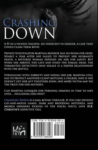 A PI in a vicious tailspin. An innocent in danger. A case that could claim them both. Private Investigator Martina Monroe has no room for grief. Nearly a year after she failed to prevent her husband's death, a battered woman depends on her for safety. But when she arrives too late and finds the female dead, the tormented detective's only solace is a deeper relationship with the bottle. Struggling with sobriety and doing her job, Martina still has to protect another client battling a stalker. And if she doesn't get her act together soon, one more victim may pay the price for her mistakes. Can Martina conquer her personal demons in time to save lives... including her own? Crashing Down is a nail-biting thriller. If you like devious cat-and-mouse games, dark and brooding mysteries, and broken heroines picking up the pieces, you'll love H.K. Christie's addictive tale.
