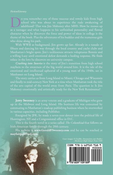 Crashing into Sunrise portrays a rowdy youth's transition from teenage mayhem to the awareness of the larger world around him. It depicts the emotional and intellectual upheaval of a young man of the 1940s surrounded by his adventurous buddies and the girls who shine along his path. This is Jim Mahoney, a reckless teenager with an unfinished personality and flawed character who discovers the force and power of ideas, books, love and music in college. Crashing into Sunruse is one of several stand-alone novels about the lives of an Irish-American family in the 20th century.