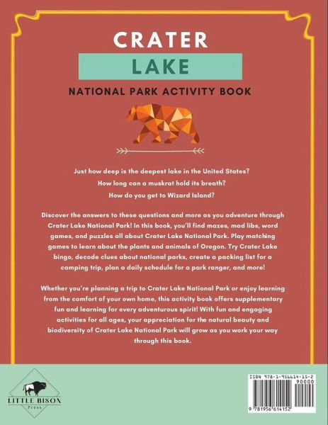 A guide to exploring Crater Lake National Park for kids ages 7 to 12 Encourage young nature lovers to learn about Crater Lake National Park. This book is filled with fun and educational activities like mazes, mad libs, word games, and puzzles. Play matching games about the plants and animals that live in the park. Learn about Leave No Trace principles and consider your impact on the land. Unscramble names of animals, decode a puzzle using American Sign Language, make a packing list for a camping trip, and learn all about Wizard Island. Kids will also learn about conservation while using their imaginations to pretend they are a park ranger. This standout activity book includes: ¿ 45 pages of independent activities¿Complete puzzles, unscramble things you can do at Crater Lake, show your knowledge of bear safety, connect the dots, and more! ¿ Range of adaptable activities for anywhere¿The activity pages offer complementary learning with or without a visit to Crater Lake National Park. Activities are appropriate and adaptable so all kids can start learning, no matter where they are. ¿ Important skill-building¿By stopping to notice and record what's going on around them, kids will practice important skills like creative thinking, observation, writing, drawing, wilderness safety, and more. This book is great for long car rides, screen-free time, vacation, camping trips, or to complement homeschool curriculum. This book makes the perfect gift for kids who love Junior Ranger programs when they visit parks.