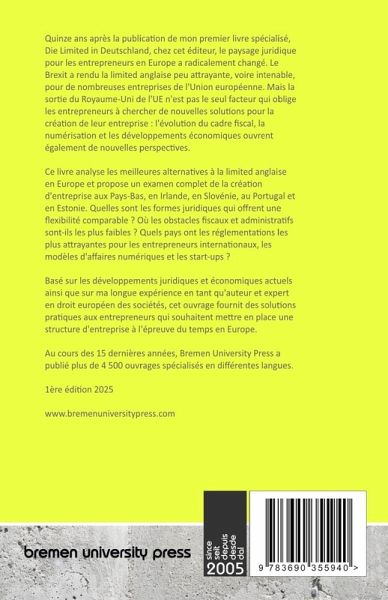 Quinze ans après la publication de mon premier livre spécialisé, Die Limited in Deutschland, chez cet éditeur, le paysage juridique pour les entrepreneurs en Europe a radicalement changé. Le Brexit a rendu la limited anglaise peu attrayante, voire intenable, pour de nombreuses entreprises de l'Union européenne. Mais la sortie du Royaume-Uni de l'UE n'est pas le seul facteur qui oblige les entrepreneurs à chercher de nouvelles solutions pour la création de leur entreprise : l'évolution du cadre fiscal, la numérisation et les développements économiques ouvrent également de nouvelles perspectives. Ce livre analyse les meilleures alternatives à la limited anglaise en Europe et propose un examen complet de la création d'entreprise aux Pays-Bas, en Irlande, en Slovénie, au Portugal et en Estonie. Quelles sont les formes juridiques qui offrent une flexibilité comparable ? Où les obstacles fiscaux et administratifs sont-ils les plus faibles ? Quels pays ont les réglementations les plus attrayantes pour les entrepreneurs internationaux, les modèles d'affaires numériques et les start-ups ? Basé sur les développements juridiques et économiques actuels ainsi que sur ma longue expérience en tant qu'auteur et expert en droit européen des sociétés, cet ouvrage fournit des solutions pratiques aux entrepreneurs qui souhaitent mettre en place une structure d'entreprise à l'épreuve du temps en Europe. Au cours des 15 dernières années, Bremen University Press a publié plus de 4 500 ouvrages spécialisés en différentes langues.