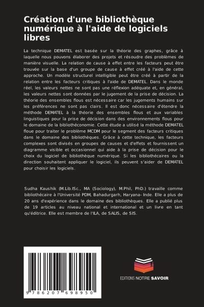 La technique DEMATEL est basée sur la théorie des graphes, grâce à laquelle nous pouvons élaborer des projets et résoudre des problèmes de manière visuelle. La relation de cause à effet entre les facteurs peut être trouvée sur la base d'un groupe de cause à effet créé à l'aide de cette approche. Un modèle structurel intelligible peut être créé à partir de la relation entre les facteurs critiques à l'aide de DEMATEL. Dans le monde réel, les valeurs nettes ne sont pas une réflexion adéquate et, en général, les valeurs nettes sont données par le jugement de la prise de décision. La théorie des ensembles flous est nécessaire car les jugements humains sur les préférences ne sont pas clairs. Il est donc nécessaire d'étendre la méthode DEMATEL à la théorie des ensembles flous et aux variables linguistiques pour la prise de décision dans des environnements flous pour le domaine de la bibliothéconomie. Cette étude a utilisé la méthode DEMATEL floue pour traiter le problème MCDM pour le segment des facteurs critiques dans le domaine des bibliothèques. Grâce à cette technique, les facteurs complexes sont divisés en groupes de causes et d'effets et fournissent un diagramme visible et occasionnel qui aide à la prise de décision pour le choix du logiciel de bibliothèque numérique. Si les bibliothécaires ou la direction souhaitent appliquer le logiciel, ils peuvent s'aider de DEMATEL pour choisir les logiciels.