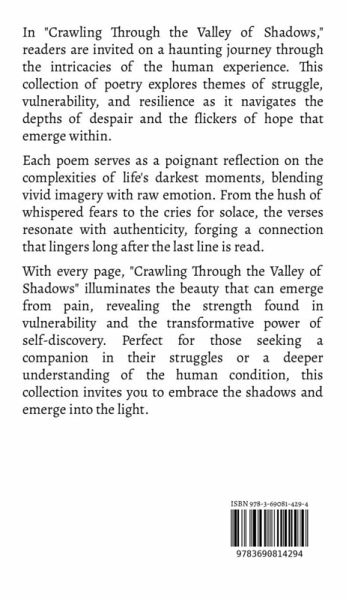 In "Crawling Through the Valley of Shadows," readers are invited on a haunting journey through the intricacies of the human experience. This collection of poetry explores themes of struggle, vulnerability, and resilience as it navigates the depths of despair and the flickers of hope that emerge within. Each poem serves as a poignant reflection on the complexities of life's darkest moments, blending vivid imagery with raw emotion. From the hush of whispered fears to the cries for solace, the verses resonate with authenticity, forging a connection that lingers long after the last line is read. With every page, "Crawling Through the Valley of Shadows" illuminates the beauty that can emerge from pain, revealing the strength found in vulnerability and the transformative power of self-discovery. Perfect for those seeking a companion in their struggles or a deeper understanding of the human condition, this collection invites you to embrace the shadows and emerge into the light.