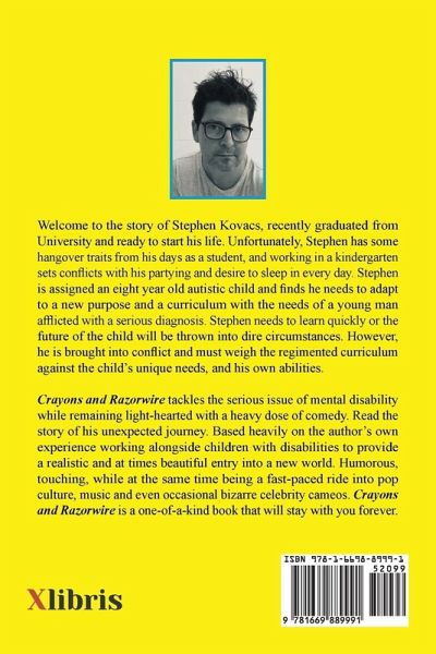 Welcome to the story of Stephen Kovacs, recently graduated from University and ready to start his life. Unfortunately, Stephen has some hangover traits from his days as a student, and working in a kindergarten sets conflicts with his partying and desire to sleep in every day. Stephen is assigned an eight year old autistic child and finds he needs to adapt to a new purpose and a curriculum with the needs of a young man afflicted with a serious diagnosis. Stephen needs to learn quickly or the future of the child will be thrown into dire circumstances. However, he is brought into conflict and must weigh the regimented curriculum against the child's unique needs, and his own abilities. Crayons and Razorwire tackles the serious issue of mental disability while remaining light-hearted with a heavy dose of comedy. Read the story of his unexpected journey. Based heavily on the author's own experience working alongside children with disabilities to provide a realistic and at times beautiful entry into a new world. Humorous, touching, while at the same time being a fast-paced ride into pop culture, music and even occasional bizarre celebrity cameos. Crayons and Razorwire is a one-of-a-kind book that will stay with you forever.