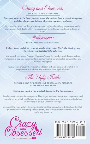 Crazy & Obsessed: The Complete Collection Crazy & Obsessed: Addicted to Relationships Everyone wants to be loved, but for some, the path to love is paved with grave mistakes, dangerous liaisons, obsession, jealousy, and rage. Uncontrolled emotions, long-festering rage, and mind-numbing depression feed a dark energy that dwells within the recesses of an unhinged mind and a desperate heart. #obsessed: Instagram Exposes Humanity Riches, fame, and clout come with a deceitful price. That's the ideology we have been manipulated into believing. "#obsessed: Instagram Exposes Humanity" unmasks the dark and devious side of Instagram, a popular social platform contaminated by fabricated personalities and artificial intelligence. Inside, you'll uncover their secrets and learn just how deep and twisted their desperation is to obtain and maintain their loyal followers. The Ugly Truth: The Dark Side of Borderline Personality Disorder & The Emotional Mind The human mind is the greatest danger to the human body. Borderline victims can be dangerous. They linger, confined, inside their impetuous and neurotic minds of self-mutilation, perpetual accusations, and malicious manipulations in attempts to pursue unknown cravings. Amongst the most volatile in romantic relationships, borderline individuals entice their partners before exhibiting callous apathy and infatuated terrorizations due to conflicting emotions.