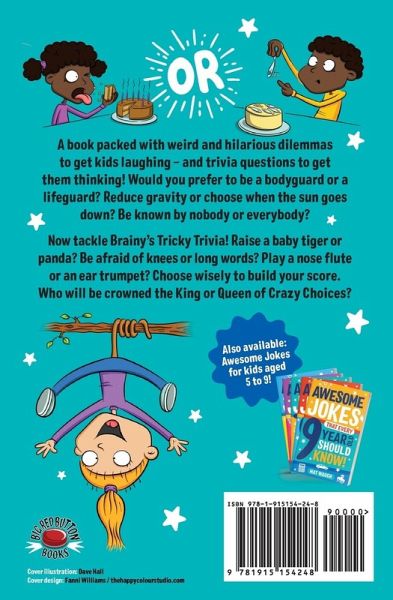 Crazy? You bet! It's like 'Would You Rather?' with rocket boosters! This is a book of choices with a difference. Weird and hilarious dilemmas will get kids laughing; tricky trivia questions will get them thinking! Impossible decisions are illustrated throughout with the craziest of cartoons. Would you prefer to be a bodyguard or a lifeguard? Reduce gravity or choose when the sun goes down? Be known by nobody or everybody? You can also expect a few icky ones that you might not want to read over breakfast, but 9-year-olds will love! Then it gets competitive as kids take on Brainy's Tricky Trivia. Which is the best choice: to raise a baby tiger or a panda? Be afraid of knees or long words? Play a nose flute or an ear trumpet? Kids will love finding out the 'right' answer! Each choice has a score, depending on how mad, bad or crazy it is. Who will be crowned the King or Queen of Crazy Choices? It's a game book that kids will want to read and play with friends, parents and anyone else who'll listen! Look out for the other books in the Crazy Choices series for ages 6 to 10 - and the companion Awesome Jokes books, too!