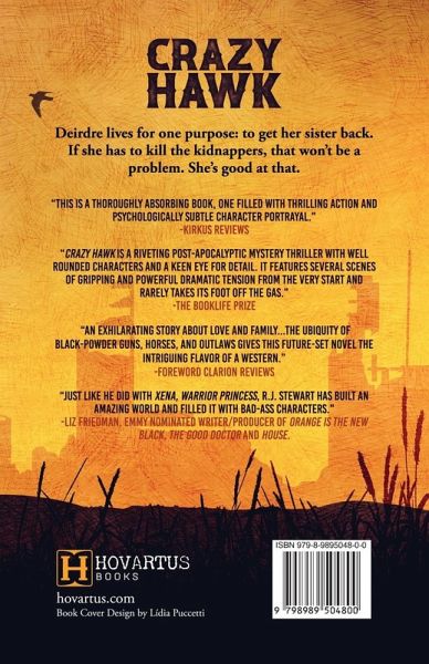 Deirdre lives for one purpose: to get her sister back. Riding her Soul Horse, Danny, she relentlessly pursues the kidnappers through an America wrecked by the Great Virus and endless civil war. She's forced by circumstances to ally with a nomadic photographer. His gentle decency moves her to the core, but her mission leads her away from the man she's falling in love with and toward a confrontation with the people who hold her sister. To defeat them, she'll need the help of the powerful Nations, a league of indigenous tribes. But there's a problem. The Nations consider Deirdre a deadly enemy. They've even given her a nickname that signifies their grudging respect for this ferocious adversary. Crazy Hawk.