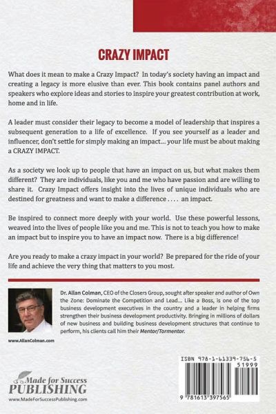 What does it mean to make a Crazy Impact? In today's society having an impact and creating a legacy is more elusive than ever. This book contains panel authors and speakers who explore ideas and stories to inspire your greatest contribution at work, home and in life. A leader must consider their legacy to become a model of leadership that inspires a subsequent generation to a life of excellence. If you see yourself as a leader and influencer, don't settle for simply making an impact... your life must be about making a CRAZY IMPACT. As a society we look up to people that have an impact on us, but what makes them different? They are individuals, like you and me who have passion and are willing to share it. Crazy Impact offers insight into the lives of unique individuals who are destined for greatness and want to make a difference . . . . an impact. Be inspired to connect more deeply with your world. Use these powerful lessons, weaved into the lives of people like you and me. This is not to teach you how to make an impact but to inspire you to have an impact now. There is a big difference! Are you ready to make a crazy impact in your world? Be prepared for the ride of your life and achieve the very thing that matters to you most.