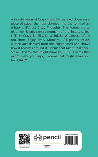 A Combination of Crazy Thoughts penned down on a piece of paper then transformed into the form of an e-book... It's just Crazy Thoughts. The Poems are to read, feel & enjoy every moment of the Beauty called LIFE. Be Crazy, Be Silly, Be Weird, Be Whatever... Life is too short. Enjoy Every Moment... All poems inside, written and derived from one single word and shows how it revolves around it. Poems that might make you Smile... Poems that might make you CRY... Poems that might make you Enjoy... Poems that might make you feel CRAZY...