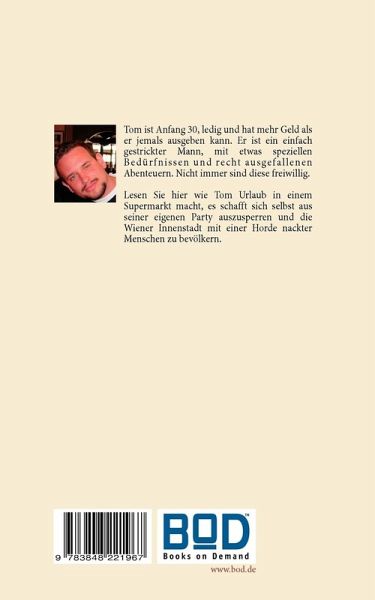 Tom ist Anfang 30, ledig und hat mehr Geld als er jemals ausgeben kann. Er ist ein einfach gestrickter Mann, mit etwas speziellen Bedürfnissen und recht ausgefallenen Abenteuern. Nicht immer sind diese freiwillig. Lesen Sie hier wie Tom Urlaub in einem Supermarkt macht, es schafft, sich selbst aus seiner eigenen Party auszusperren und die Wiener Innenstadt mit einer Horde nackter Menschen zu bevölkern.