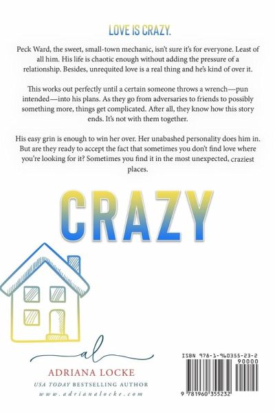 USA Today best-selling author Adriana Locke brings laughter and love in this friends-to-lovers small-town romance. Love is crazy. Peck Ward, the sweet, small-town mechanic, isn't sure it's for everyone. Least of all him. His life is chaotic enough without adding the pressure of a relationship. Besides, unrequited love is a real thing, and he's kind of over it. This works out perfectly until a certain someone throws a wrench - pun intended - into his plans. As they go from adversaries to friends to possibly something more, things get complicated. After all, they know how this story ends. It's not with them together. His easy grin is enough to win her over. Her unabashed personality does him in. But are they ready to accept the fact that, sometimes, you don't find love where you're looking for it? Sometimes, you find it in the most unexpected, craziest places.
