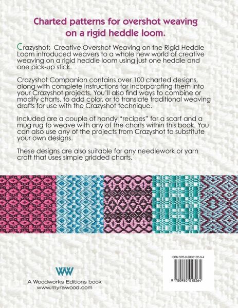 Charted patterns for overshot weaving on a rigid heddle loom. ¿¿Crazyshot: Creative Overshot Weaving on the Rigid Heddle Loom introduced weavers to a whole new world of creative weaving on a rigid heddle loom using just one heddle and one pick-up stick. Crazyshot Companion contains over 100 charted designs, along with complete instructions for incorporating them into your Crazyshot projects. You'll also find ways to combine or modify charts, to add color, or to translate traditional weaving drafts for use with the Crazyshot technique. Included are a couple of handy "recipes" for a scarf and a mug rug to weave with any of the charts within this book. You can also use any of the projects from Crazyshot to substitute your own designs. These designs are also suitable for any needlework or yarn craft that uses simple gridded charts.