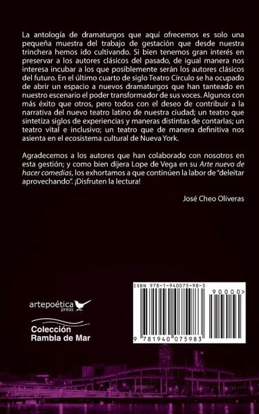 This volume collects six plays premiered at New York City's Teatro Círculo. The theater company celebrates its first 25 years with this commemorative edition under the care of Dr. Eva Cristina Vásquez. This is the first book in the new play series published by Artepoetica Press. The plays included are: ¡Qué felices son las Barbies!; Amor perdido; Un Quijote en Nueva York; Lorca Federico Lorca; Lágrimas Negras; and Trans-Mission.