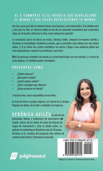 El E-commerce es el negocio que revolucionó el mundo y que puede revolucionar tu mundo. Hay dos cosas que todo ser humano desea: más ingresos y más tiempo libre. Si tú anhelas esto y más para tu vida, el comercio online es una ola en constante crecimiento que te permitirá viajar por el mundo y disfrutar la vida ¡como siempre has querido! La reconocida autora de éxitos de ventas, Verónica Avilés, comparte de manera sencilla y eficiente su metodología totalmente probada, que te permitirá crear desde cero una tienda online. ¡Y si ya tienes una, podrás multiplicar tus ventas y llegar a una audiencia global que está esperando por comprar tus productos o servicios! Miles de personas alrededor del mundo ya se han beneficiado con este método, y a través de estas páginas, tú también puedes conseguirlo. Preguntas como: ¿Dónde empezar? ¿Qué quiero vender? ¿Cuánto quiero vender? ¿Cómo conseguir más clientes? ¿Cómo promover mi tienda? Y muchas más, serán respondidas en este libro. Es hora de tener tu propio negocio y el control de tu tiempo. Despeja tus dudas, da el salto y multiplica tus ingresos. ¿VERÓNICA AVILÉS es una de las principales líderes e influencers de ecommerce del mundo. Autora de los éxitos de venta de Amazon La magia de reinventarte y Crea tu tienda online, su podcast en marketing se difunde en más de 10 países. Verónica es la creadora del programa más exitoso de comercio electrónico: ECommerce Avanzado.