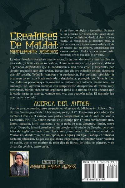 ES LIBRO NOSTALGICO Y TERRORIFICO, SE TRATA DE UN PEQUEÑO SER DESPIADADO, QUE DESDE ANTES DE SU NACIMIENTO, DESDE EL VIENTRE DE SU MADRE, YA COMANDABA SU DIABOLICO PLAN, EL CUAL ERA MASACRAR A TODA UNA COMUNIDAD, Y ATODO SER VIVIENTE QUE ALLI EXISTIERA, TORTURANDOLOS CON SEVEROS CASTIGOS, VERLOS PEDIR CLEMENCIA ERA LO QUE MAS LO DIVERTIA. LA OTRA HISTORIA: ES DE UNA JOVEN QUE DESDE SU PRIMER SUSPIRO EN ESTA VIDA, YA TRAIA ESCRITO SU DESTINO, EL CUAL LE IBA SER MUY CRUEL Y PREVERSO, POR CULPA DE PERSONAS DESPIADADAS, QUE LA CONDENARON A UNA VIDA MUY CRUEL Y MISERABLE, POR SIMPLES PREJUICIOS, EN LOS QUE ELLOS CREIAN, DECIAN ELLA ERA LA CULPABLE, POR TODA DESGRACIA QUE ALLI SUCEDIA. TODOS LA JUSGABAN Y LA CONDENARON, QUE POR ESE TONTO PREJUCIO, LA ACUSARON DE SER UNA BRUJA MALVADA, PROTEJIDA POR SATANAS, POR ESO SE UNIERON EN TRATAR DE MASACRARLA, PERO NO LA MASACRARON, SOLO EN UNA FORMA MUY MISTERIOSA DESAPARECIO, ENCONTRANDOLA CEPULTADA, JUNTO A UNA TUMBA DE UNA ANCIANA QUE LA CUIDO ASTA SU MUERTE, CUANDO SOLO ERA UNA PEQUEÑA NIÑA. EL MISTERIO FUE QUE NADIE LA CEPULTO .