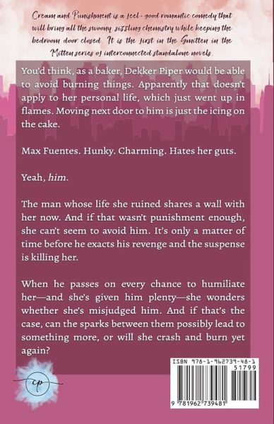 Revenge is a dish best served cold. You'd think, as a baker, Dekker Piper would be able to avoid burning things. Apparently that doesn't apply to her personal life, which just went up in flames. Moving next door to him is just the icing on the cake. Max Fuentes. Hunky. Charming. Hates her guts. Yeah, him. The man whose life she ruined shares a wall with her now. And if that wasn't punishment enough, she can't seem to avoid him. It's only a matter of time before he exacts his revenge and the suspense is killing her. When he passes on every chance to humiliate her-and she's given him plenty-she wonders whether she's misjudged him. And if that's the case, can the sparks between them possibly lead to something more, or will she crash and burn yet again? Cream and Punishment is a feel-good romantic comedy that will bring all the swoony, sizzling chemistry while keeping the bedroom door closed. It is the first in the Smitten in the Mitten series of interconnected standalone novels.